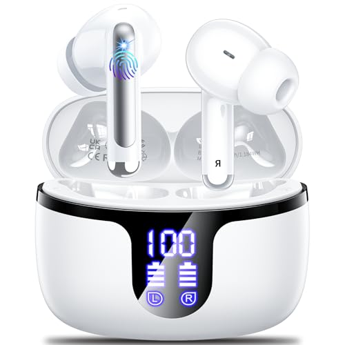 – 【50 Horas de Reproducción y Pantalla LED】: Auriculares Bluetooth duran de 8 horas con una sola carga con una sola carga, mientras que el estuche de carga puede extenderlo a 50 horas.Ya sea que estés haciendo ejercicio, disfrutando de la música o concentrándote en el trabajo,no te preocupes de que tus auriculares se queden sin batería. La caja de carga está equipada con una pantalla LED,que puede leer directamente los datos de energía de la caja de carga.Se puede cargar completamente en 1,5 horas