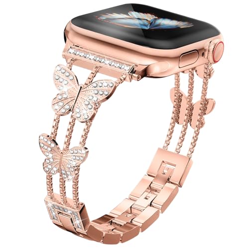 – [Material de alta calidad] La correa de repuesto MaEiol está fabricada en acero inoxidable 304. Es resistente a la corrosión, dura y resistente al desgaste, con un brillo y una textura elegantes, agradable al tacto y no irrita la piel. Diseño único y moderno: Bonitas mariposas con diamantes en la correa del Apple Watch. Con incrustaciones de brillantes diamantes de imitación, la hermosa y brillante correa para iWatch luce lujosa, brillante y elegante.